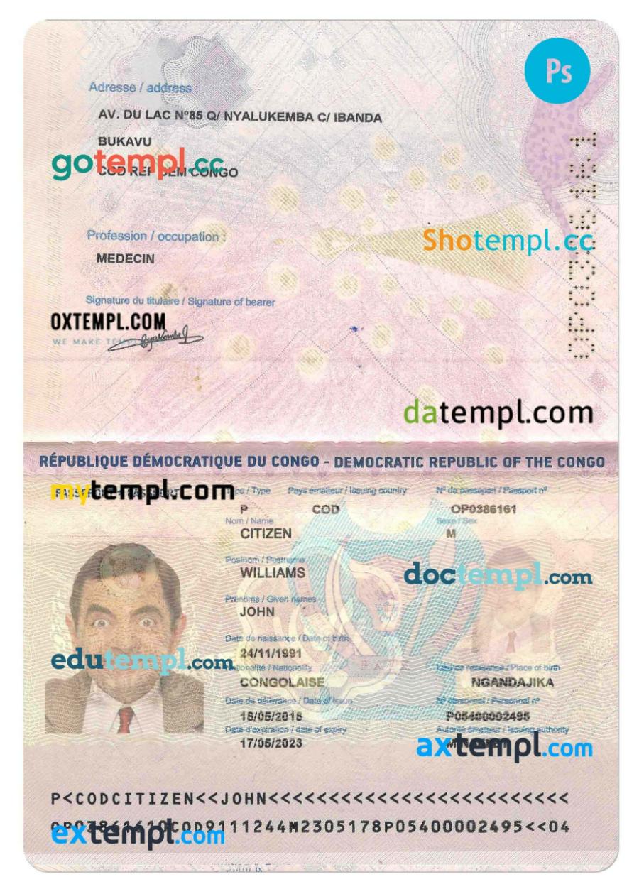Congo passport editable PSD files, scan and photo look templates, 2 in 1 2015-present