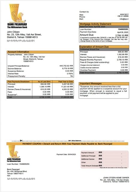 Iran Bank Pasargad mortgage statement Word and PDF template