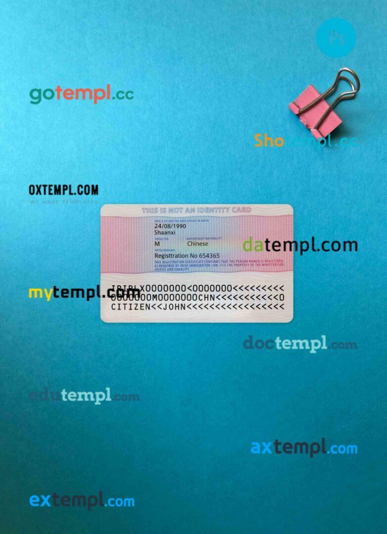 Our Irish residence permit template offers two editable variants in one package: editable PSD files for both photo and scan looks. Compatible with Adobe Photoshop, this template is fully customizable, requiring only basic editing knowledge to personalize.
