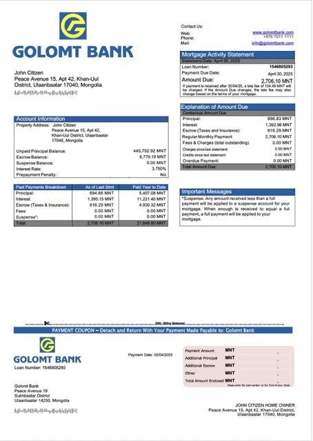 It typically includes detailed information about your loan, including: outstanding loan balance, payment history, payment due, interest and principal breakdown, escrow account, past due amount (if any), interest rate, loan terms and additional fees.