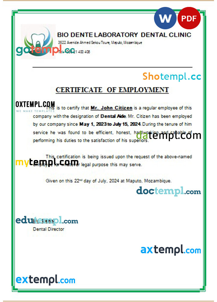 Fully editable Mozambique Biodente Laboratory Dental Clinic certificate of employment Word and PDF template at the best price.