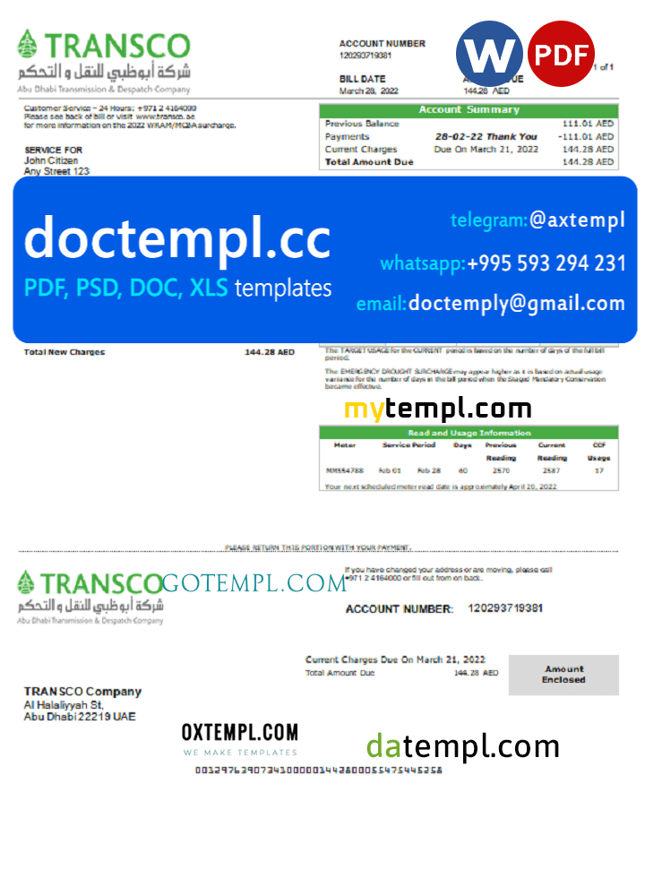 Like all our documents, UAE Abu Dhabi Transmission & Despatch Company (TRANSCO) utility bill template is of high quality, which may be used as a proof of address in many sites.