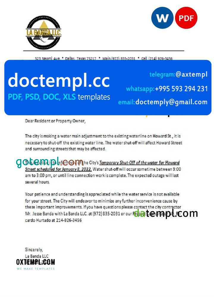 Completely editable USA Texas La Banda utility water shut off notice, .doc and .pdf template is of high quality.